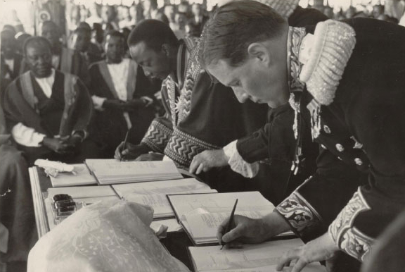 The Kabaka of Buganda Ronald Muwenda Mutebi II of Buganda stands under a shelter during his enthronement ceremony in 1993